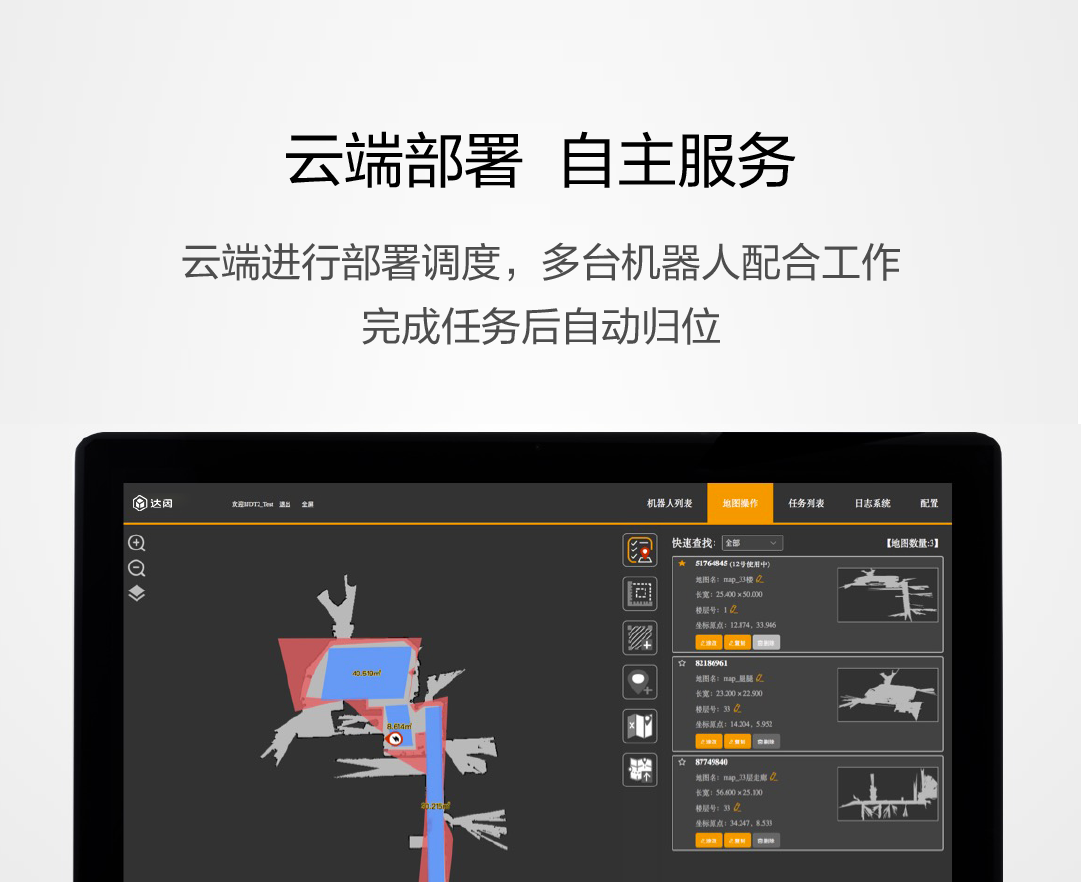 云端进行部署调度,多台机器人配合工作,完成任务后自动归位。